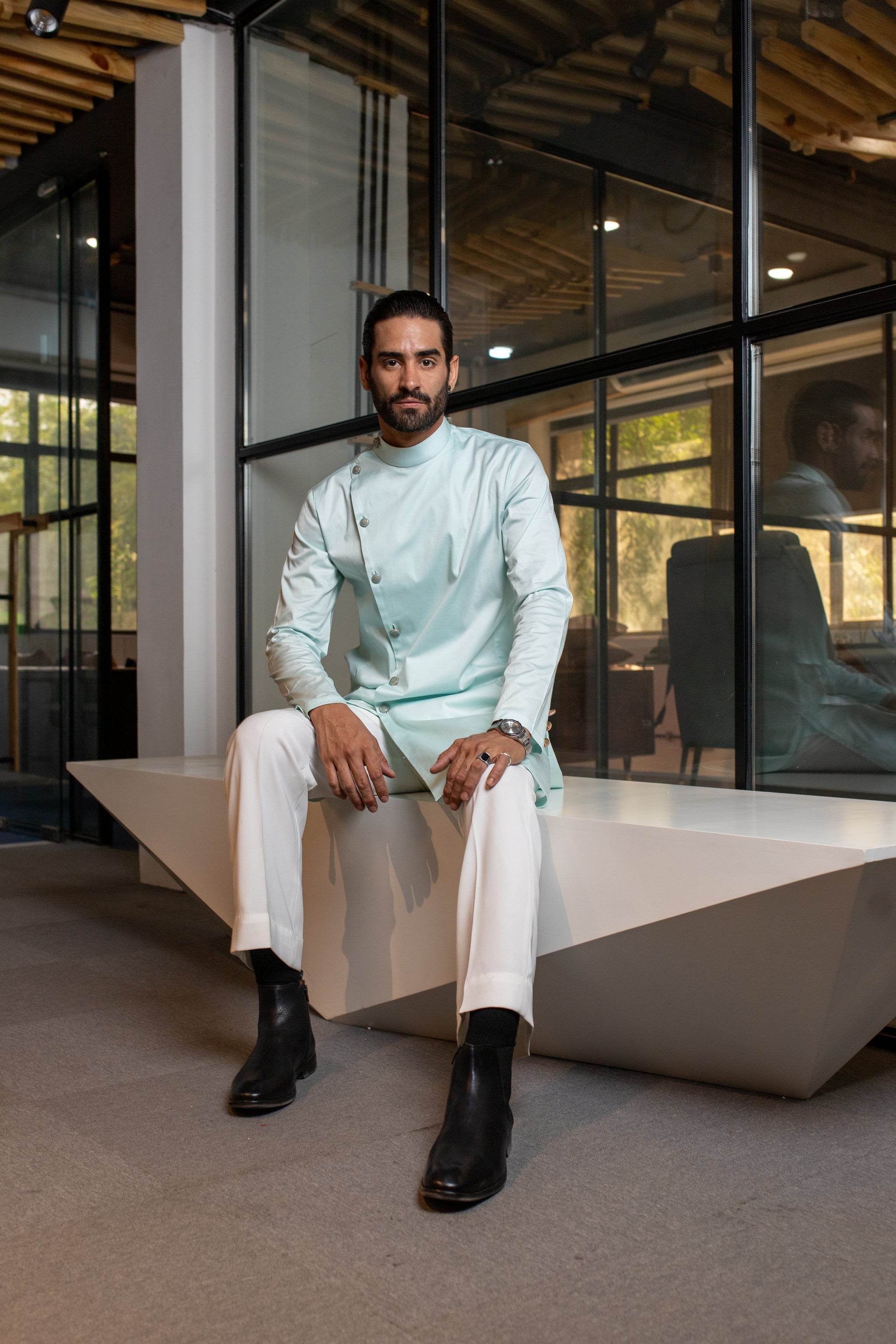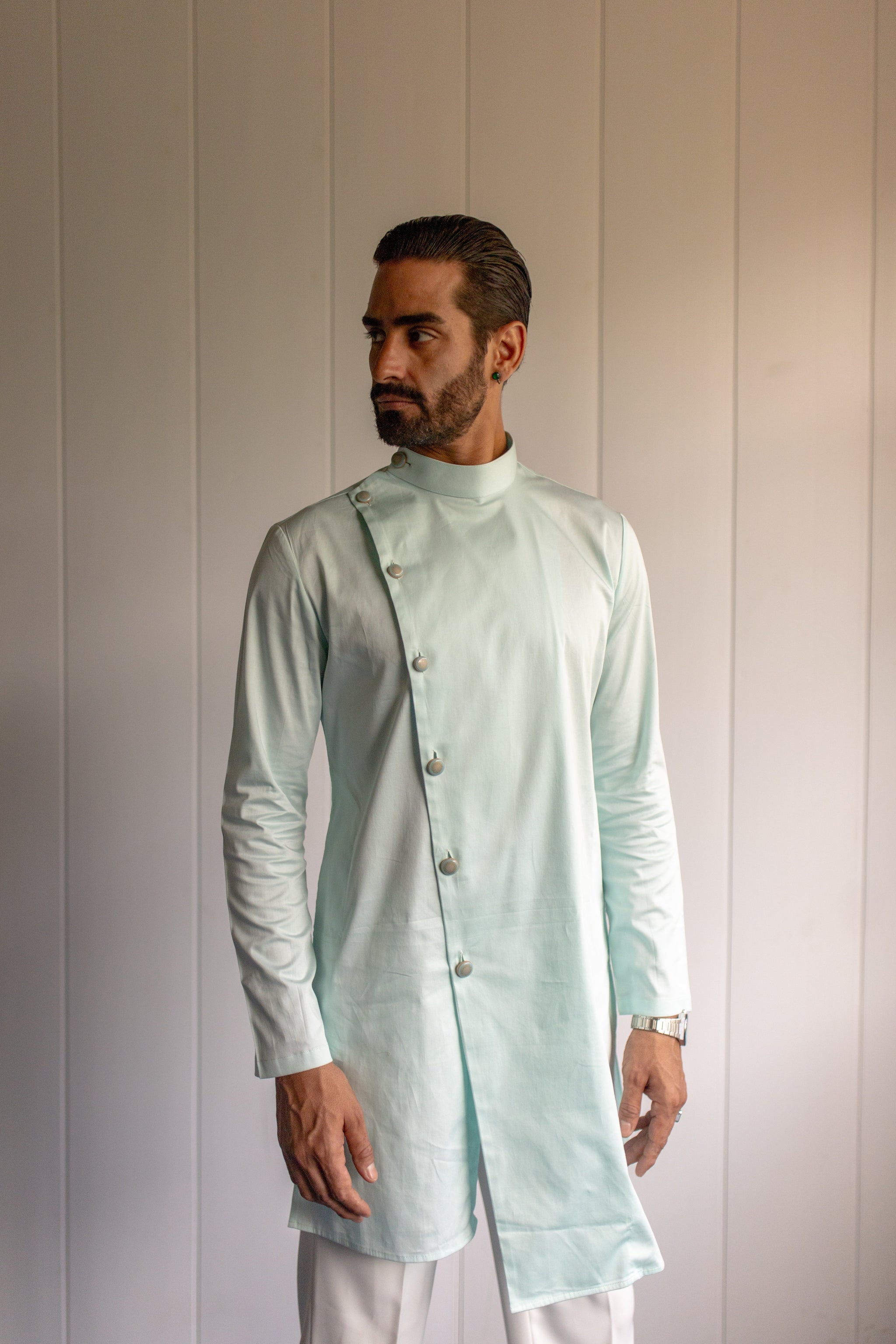 The Asymmetric Mint Green Kurta is a contemporary take on traditional style. This kurta features a fresh mint green color and an asymmetric hemline, adding a modern twist to its classic design. Crafted from lightweight, breathable fabric, it offers comfort and elegance. The kurta includes intricate detailing and a streamlined fit, making it ideal for festive occasions or casual gatherings, and ensures you stand out with a unique and stylish flair.